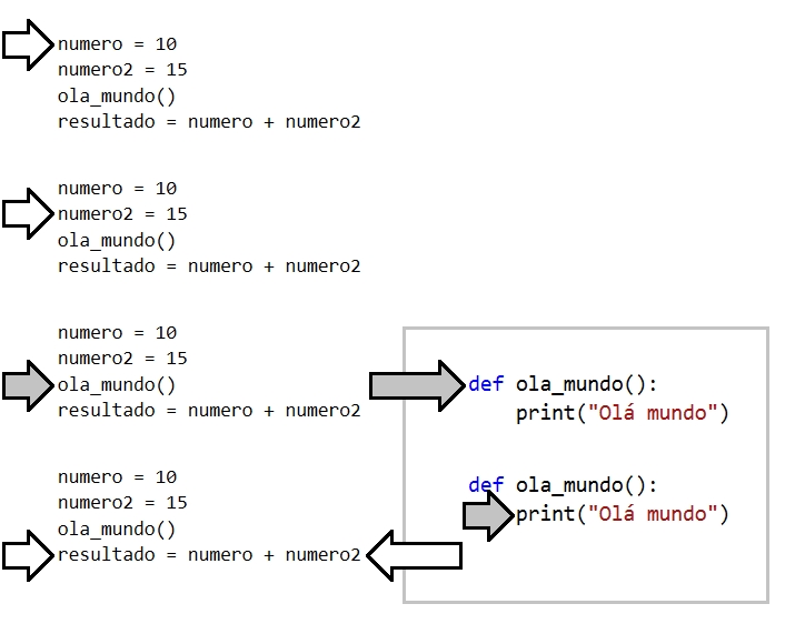 Bom, primeiro as duas variáveis numero e numero2 são declaradas e os valores 10 e 15 são atribuídos à elas respectivamente. Depois dessas duas linhas iniciais a função ola_mundo é executada.